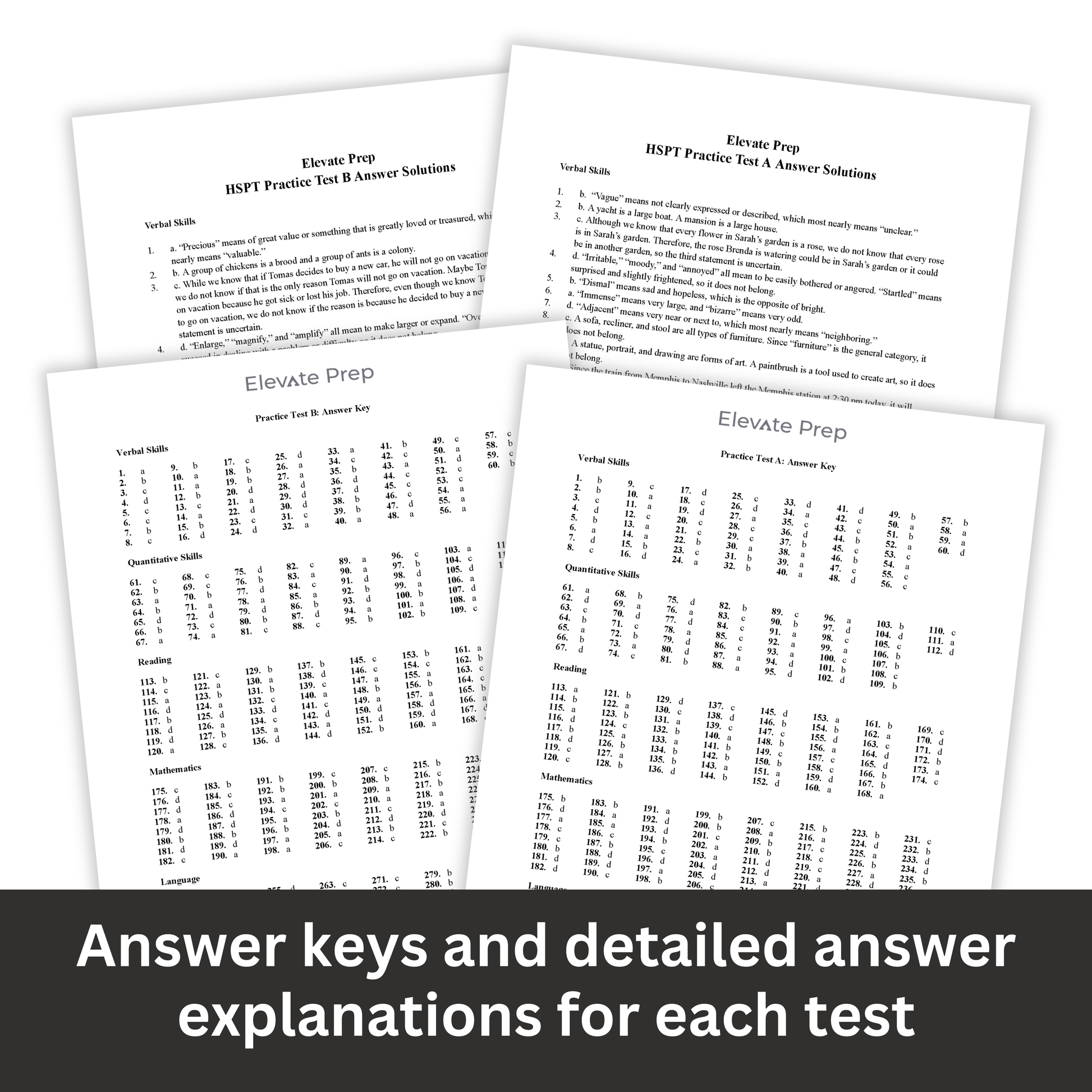 - Answer keys at the end of each test